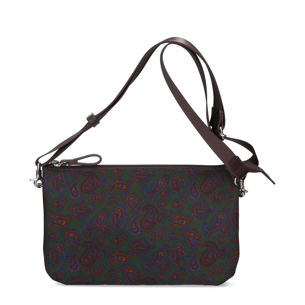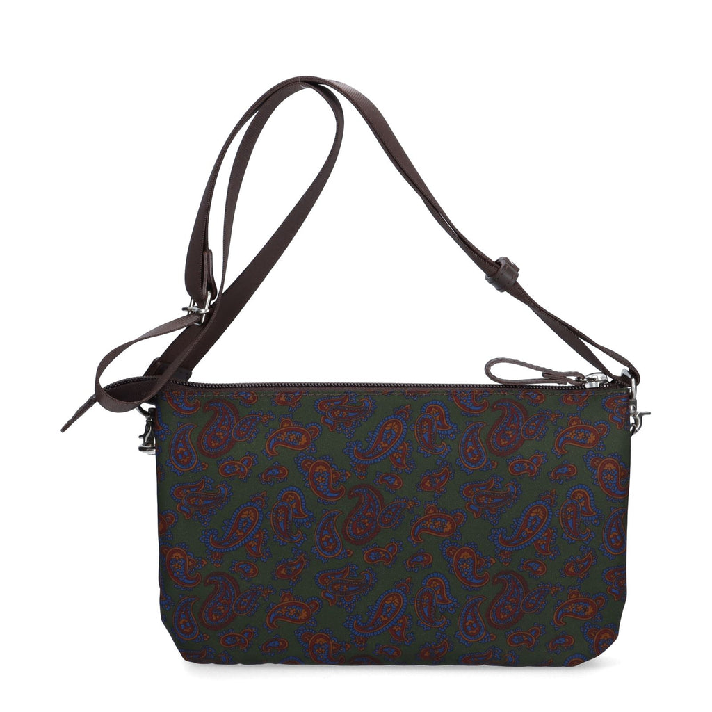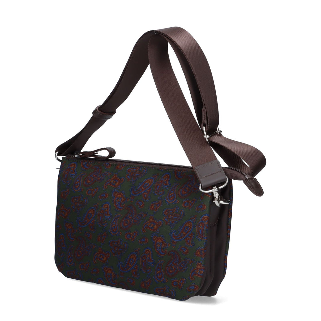 バッグの中で荷物が迷子にならない充実のポケットが魅力。細々した小物が必要な時にすぐに見つけやすいように、サイズや深さを変えたポケットをデザインしています。メインのファスナーを開けると内側が5つに分かれています。中央は安心のファスナー式。貴重品の収納にぴったりです。落ち着いた色合いのペーズリー柄は、装いに馴染みやすく合わせやすいのもポイントです。