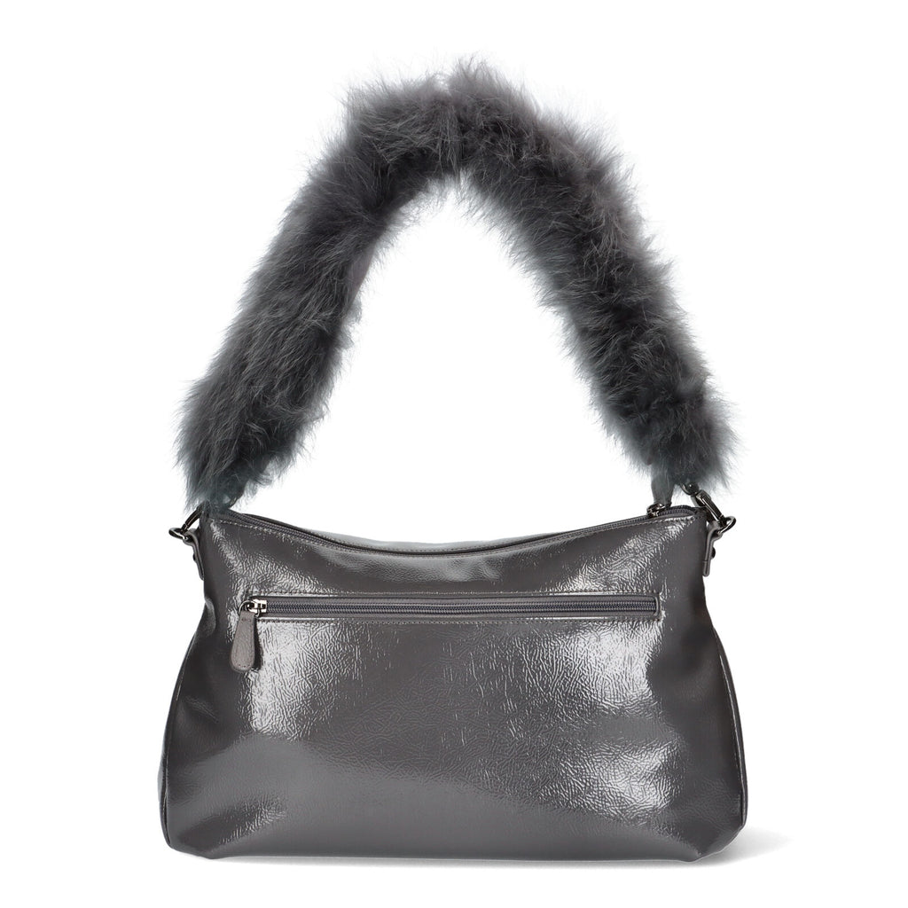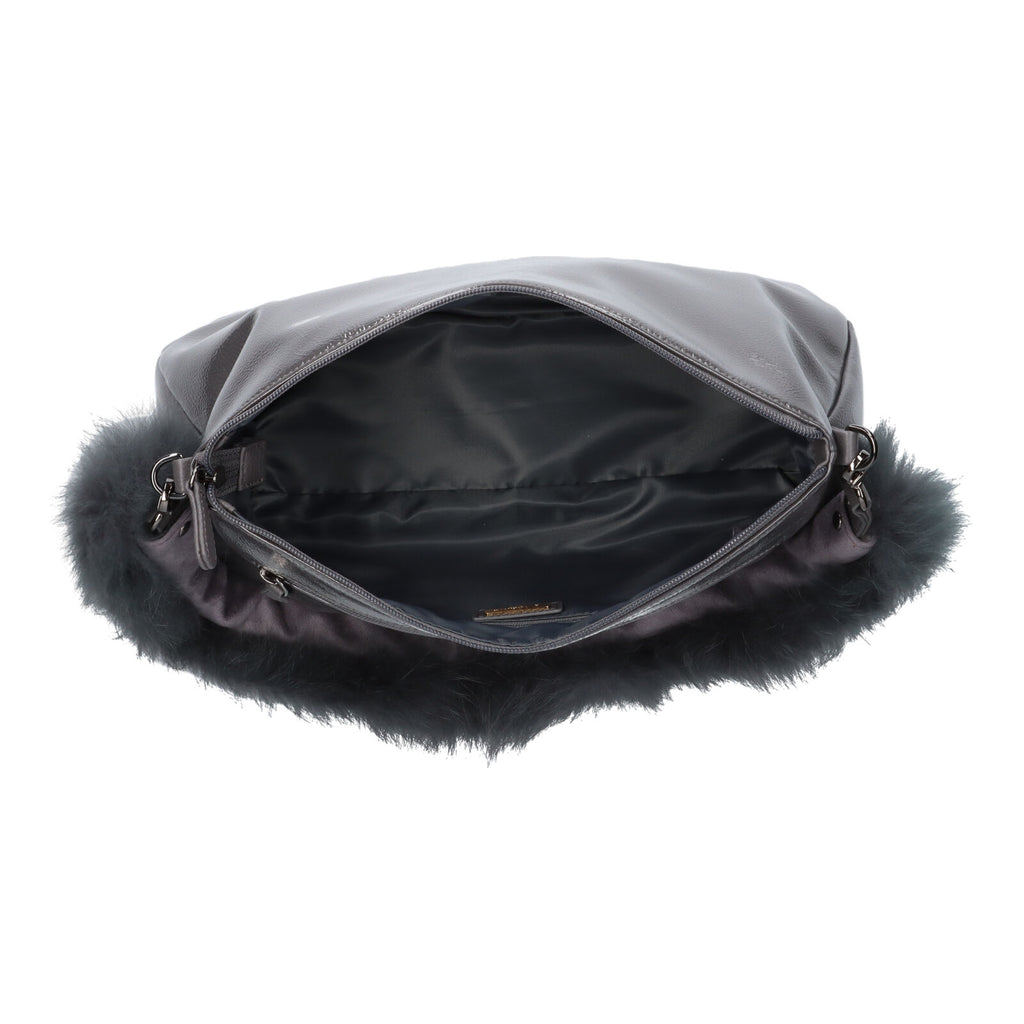 ショルダーと斜め掛けのスタイルが楽しめるバッグです。シンプルなデザインながらフォックスファーの手紐が華やか。これ1本加えるだけコーディネートがグッと楽しくなります。フォックスファーは、ストラップから抜く事が出来ます。暖かい時期や、シンプルに持ちたい時にお勧めです。外したフォックスファーはフックが付いているので、襟巻きとして活躍する優れもの。開閉は安心のファスナー式。背側にはファスナーポケット。内側にも長財布が入るファスナーポケット、オープンポケットが付いています。