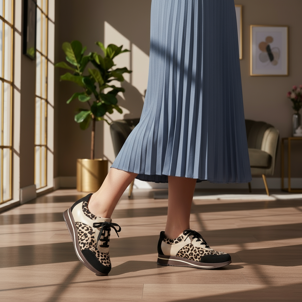 銀座ヨシノヤのオリジナルインソールを搭載。クッション性に優れ軽量、耐久性が良い材質を使用。履いた時に足裏に感じるクッション感とソフト感は抜群です。トレンド感のある厚めのソールで、スッキリとした軽快なコーディネートを楽しめます。ストローベル製法なので、厚底でも軽量なシューズ。ヒョウ柄のフロッキー素材をメインにした異素材コンビネーションが新鮮です。