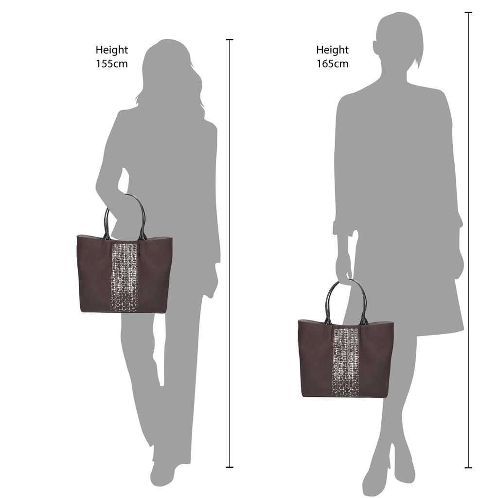 通勤やお出かけに活躍するデイリーなトートタイプのバッグ。気分が華やぐデザインです。本体には軽くお手入れがしやすいポリエステルスエードと合皮エナメルを使用しています。印象的なスパンコールの装飾は、お洋服や身体を傷つけ難い刺繍方法を用いています。開閉はマグネット。内側には長財布や貴重品が入るファスナーポケット、小物を収納するオープンポケットに加えて、スナップ留めの大きなポケットも付けました。ついつい何処かに紛れ込んでしまう細々した物を綺麗に収納できる嬉しい仕様です。置いた時に汚れや傷が付きにくいように底鋲付きです。