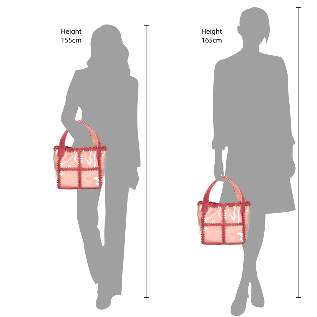 涼しけなPVC素材に、職人がかぎ針でひとつひとつ手仕事でナイロン糸を編み込んだバッグ。裏にコットンを合わせる事で中が見えない仕立てにしました。内側にポケットを付け小物を分けて収納が可能です。透明感があるPVC素材は春夏にぴったりです。またシューズや洋服に色を合わせると統一感があるスタイリングになり、お勧めです。※PVC素材とは・・・ポリ塩化ビニルと呼ばれるプラスチックです。長靴やプールバッグなどに使わる身近な素材です。水や汚れに強いのが特徴です。高温な場所では変形のおそれがあります。