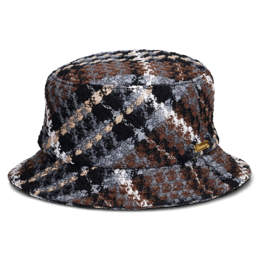 大柄なチェックツイード生地を使用したお洒落なバケットハットはUVカット、サイズ調整等機能面にも優れたカジュアルハット