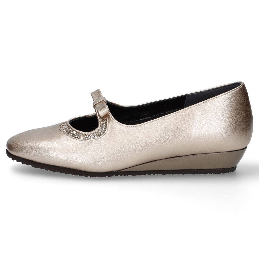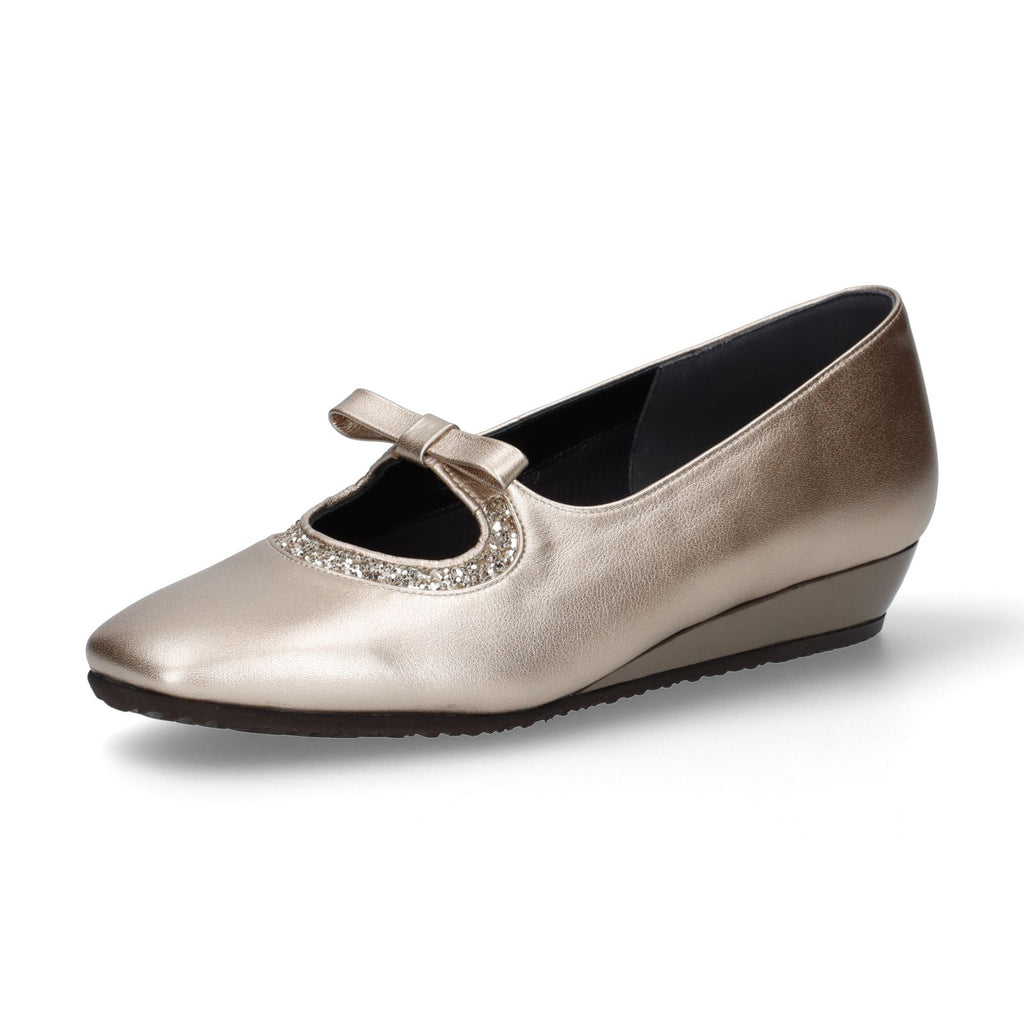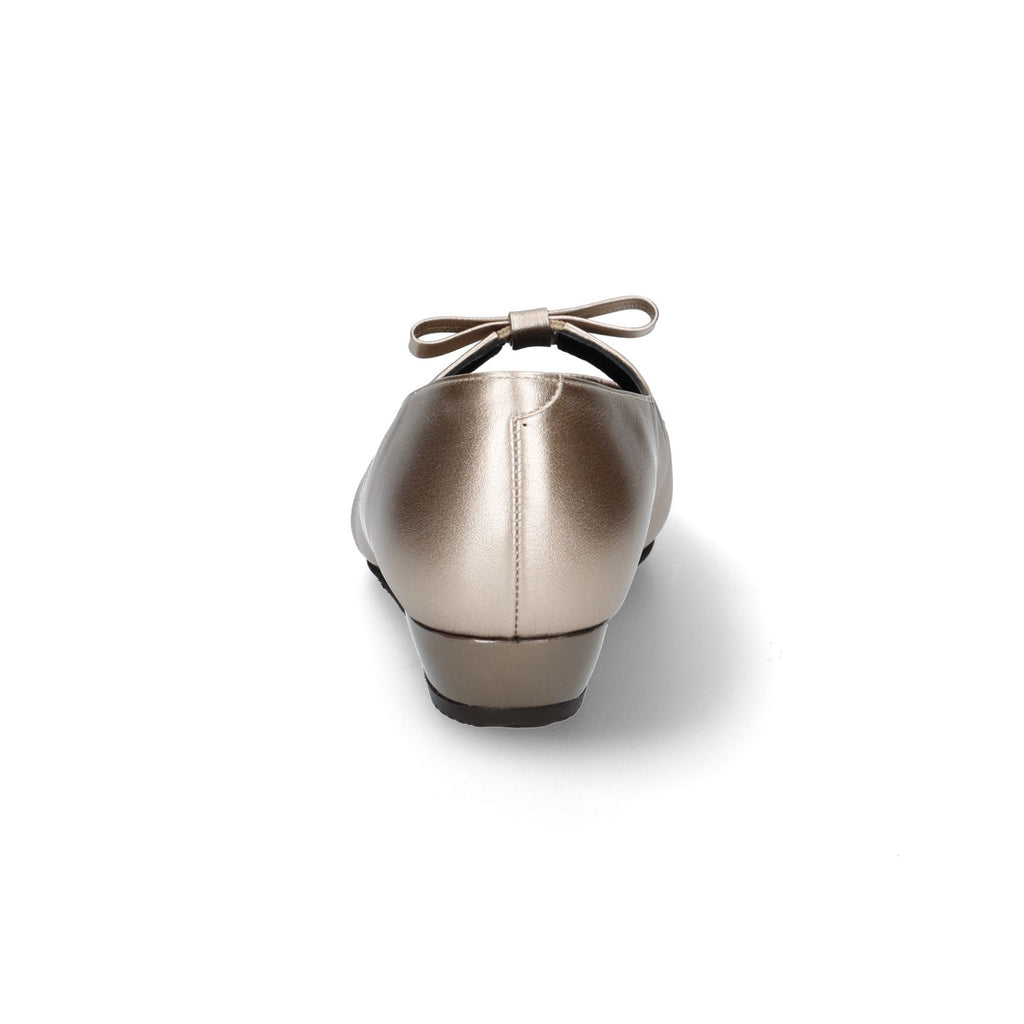 メタリック素材の光沢感とグリッターが足元を華やかに演出するデイリーパンプス。安定感のあるローヒールのウェッジソールと、甲飾りのリボンの下にはゴムを設置しており甲押さえが良く、普段使いに重宝する一足。