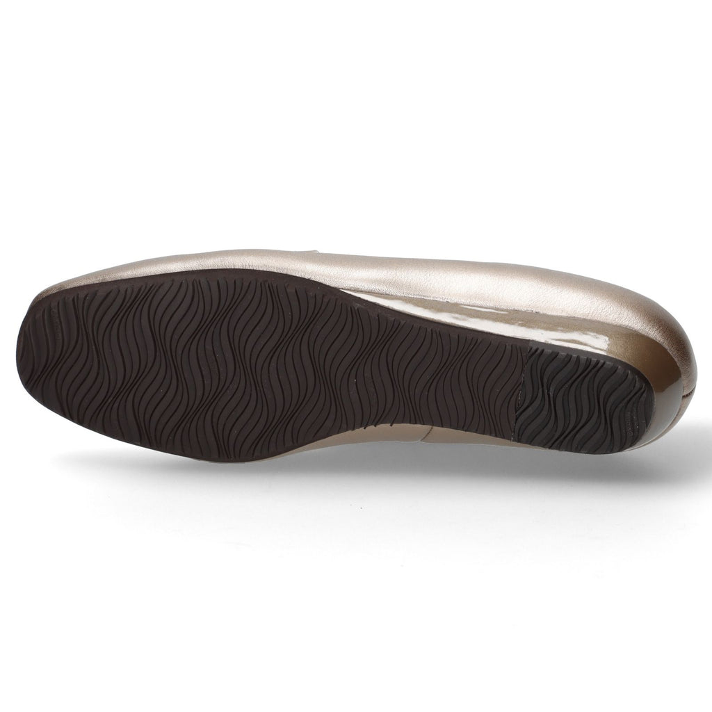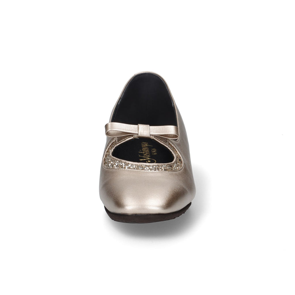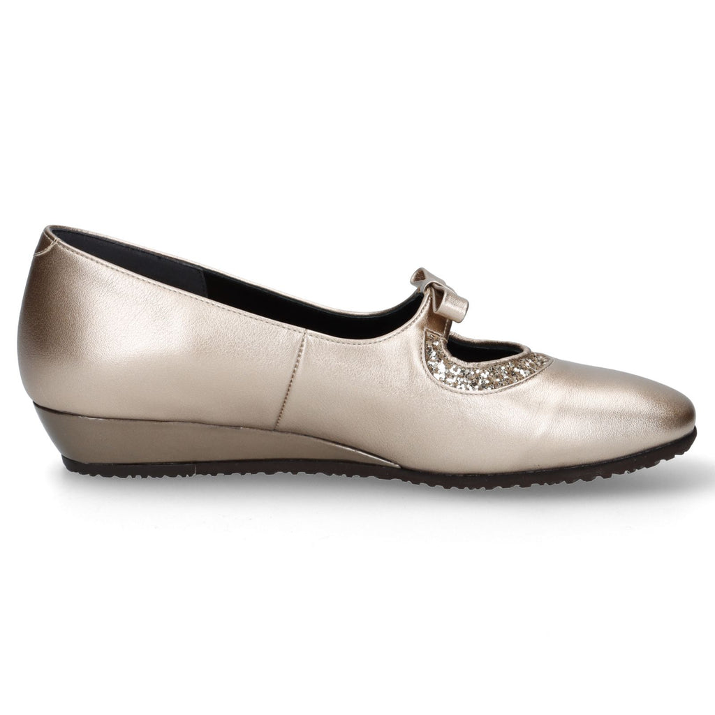 メタリック素材の光沢感とグリッターが足元を華やかに演出するデイリーパンプス。安定感のあるローヒールのウェッジソールと、甲飾りのリボンの下にはゴムを設置しており甲押さえが良く、普段使いに重宝する一足。