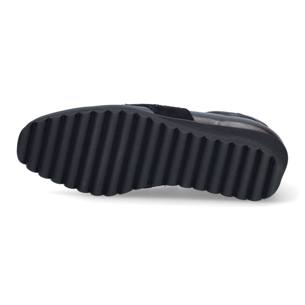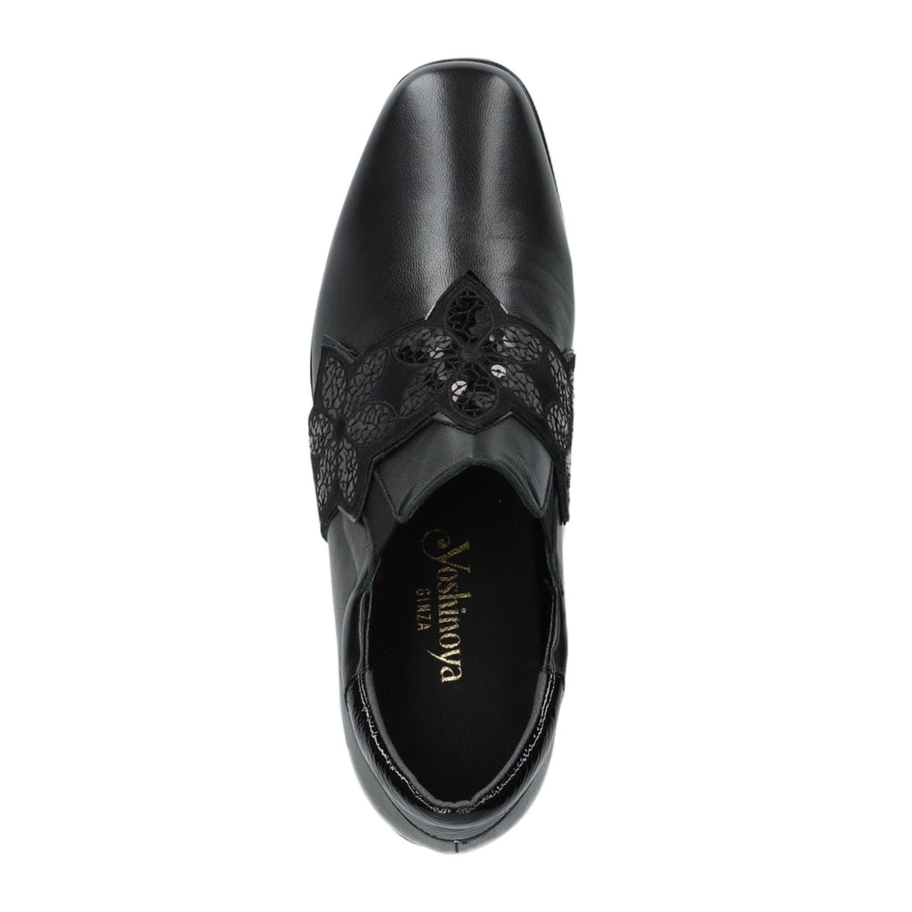 ひざ下からつま先まですっきりと見え、脚長効果のあるヒールアップのスリッポンシューズ。スパンコール刺繍の異素材ベルトはエレガント感があり、コーディネートのポイントに。つま先のライニングはクッション生地を使用しており、つま先の負担を軽減します。