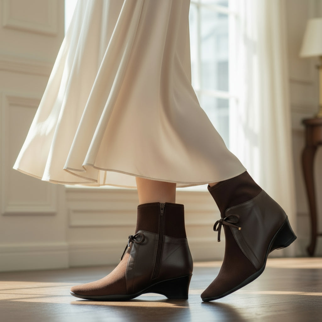 洋服の襟のような素材切り替えと、リボン飾りがフェミニンな印象を与え、スカートやフレアパンツと好相性のショートブーツ。伸びやかなつま先は指先に余裕があるうえ、衝撃吸収性に優れたモールドソールによる履き心地の良さと、防水革による晴雨兼用機能も嬉しい靴。