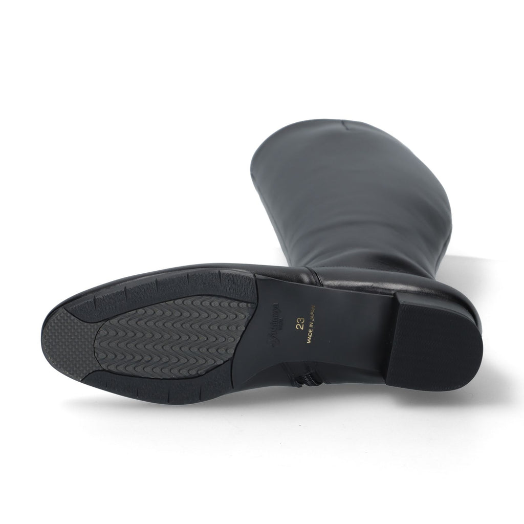 裏材にスポンジ材を貼り合わせてソフトにしています。履き始めはぴったりとフィットしますが、履くほどに足の形に馴染み、締め付け感が徐々に緩和。通常のロングブーツに比べて、筒の上部には深めのタックを施し、履き口部分の余りを目立たせない美しいシルエット。ベーシックカラーで展開し、通勤から休日まで活躍する美脚ロングブーツ。
