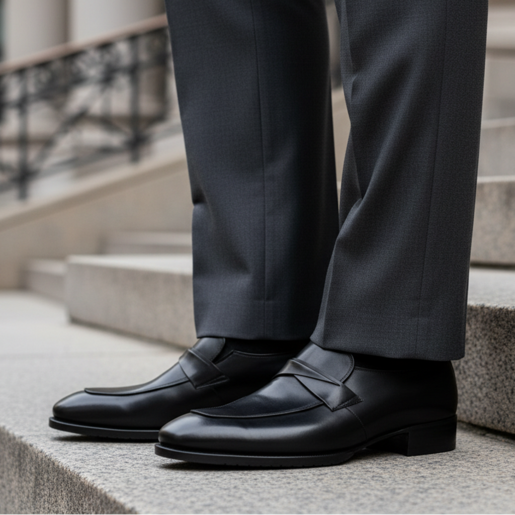 ベビーカーフを使用したスリッポンシューズ。繊細さと履き心地が両立された上質な一足。