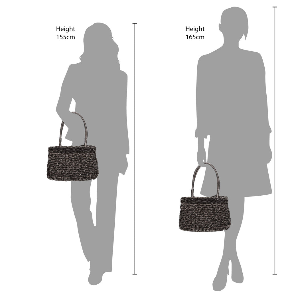 キラキラと輝くビニールテープと、シフォンリボンをニットの様にひとつひとつ手で編み込みした、陰影がとても美しいバッグ。飾り編みをさらに加えフェミニンに仕立てました。内装には携帯や小物が収納出来るオープンポケットとファスナーポケット付で、使い勝手も抜群です。膝の上にちょうど収まり、必要なポーチやお財布などが収納できるサイズです。編み方と輝きが綺麗なバッグはでフェミニンにもカジュアルスタイルにもご使用いただけます。