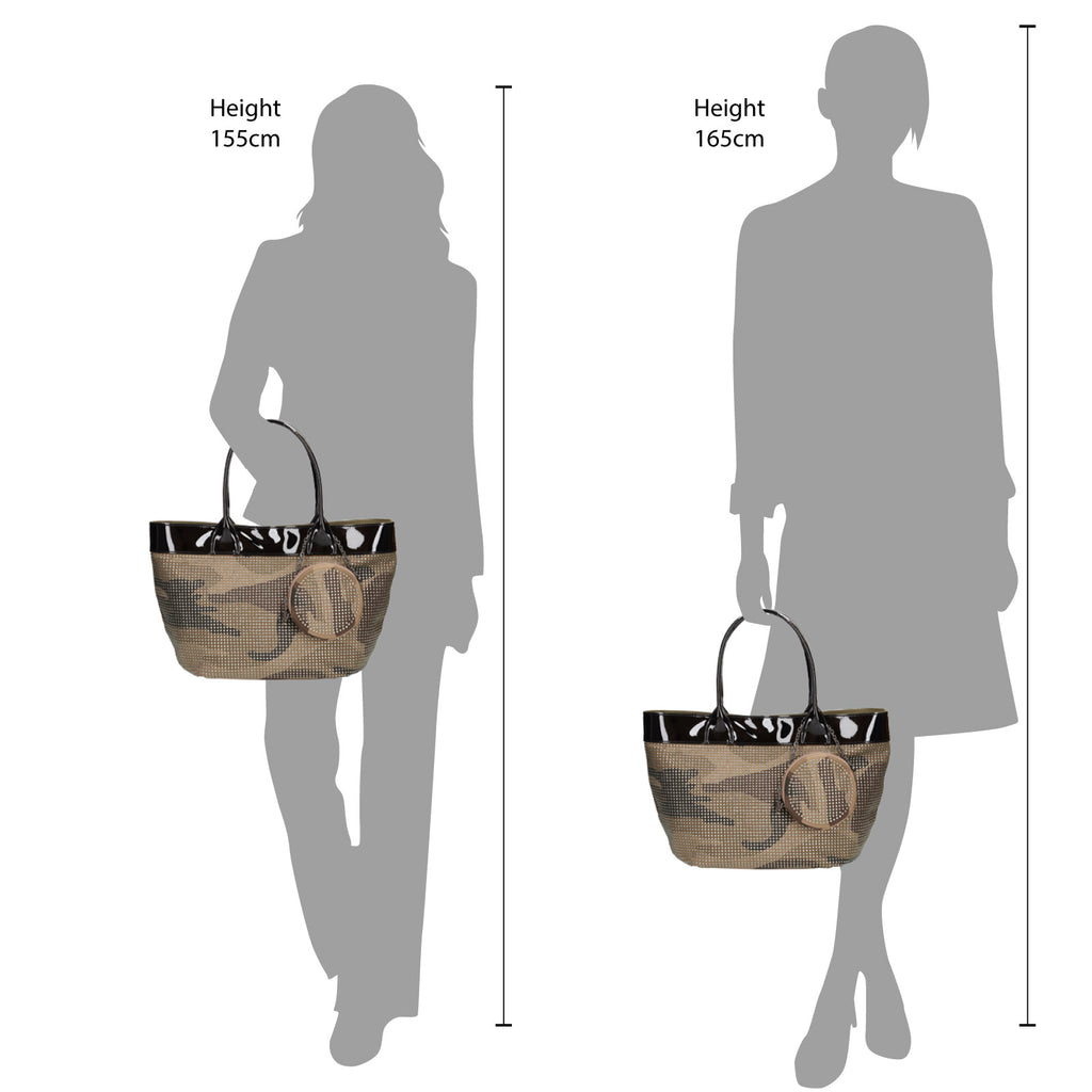 プリント素材に細やかなラインストーン(ファセット・カットされたガラスでつくれたダイヤモンドの類似石)の煌めきが装いを華やかにしてくれるバッグです。肩にかけた際に脇に収まる程よいサイズ感で、外出する際必要な小物を内側ポケットに分けて収納ができます。コットン素材と合皮エナメルを使用して軽やかさが魅力です。底に鋲を付け化粧台に置く時も安心で、底部分の痛みや汚れを和らげます。色、素材のコントラストが上品なカジュアルバッグは休日スタイルに活躍します。