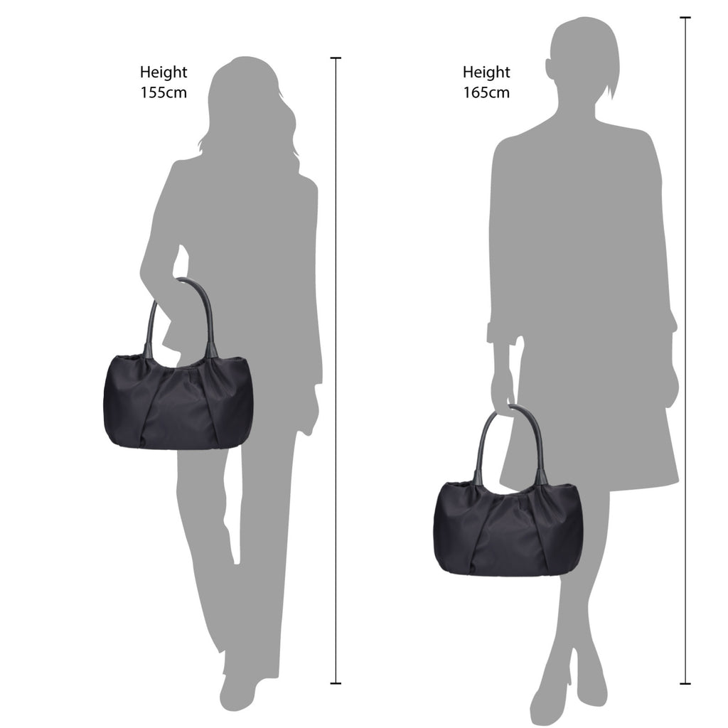 ふっくらと丸みを帯びたシルエットとタックを取り入れ、可愛い印象を仕立てたバッグです。なめらかな手触りのポリエステル素材は軽さが魅力です。マチをたっぷりと広くとり、収納力も抜群です。内装には携帯や小物が収納出来るオープンポケットとファスナーポケット付け、貴重品などを入れて安心してご使用いただけます。底板を入れ、荷物が入っても変形しない嬉しい設計です。底部分には鋲をつけ、痛みや汚れを和らげます。生地素材のバッグはシーズンを問わず活躍します。