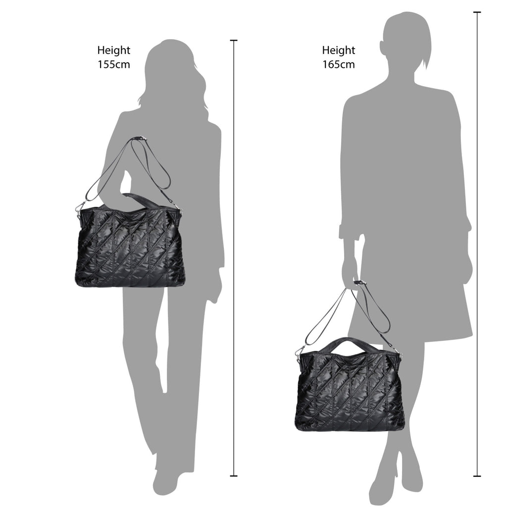 変形ダイヤ柄のキルティングで作られたトートバッグです。ふんわりとした優しいフォルムと軽さが特徴です。ショルダーベルト付きで、肩掛け・斜め掛けとスタイルを変えて楽しめる2WAY仕様が魅力です。内装のオープンポケットとファスナーポケットで小物を分けて収納が出来ます。A4サイズや雑誌なども横向きに入り、収納力が抜群です。シンプルなデザインでコーディネートを選ばず、通勤から普段使いまで幅広く使えるバッグです。