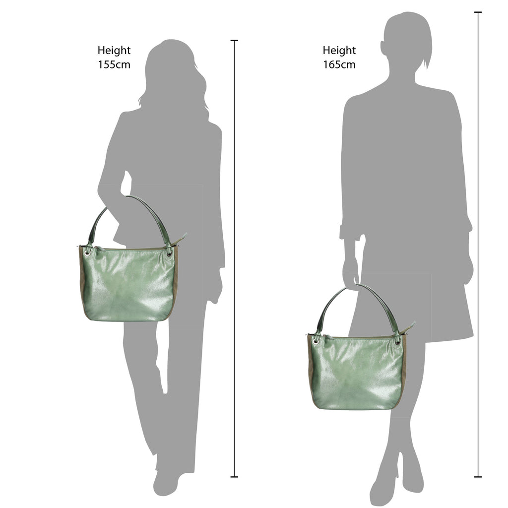 綺麗なカジュアルスタイルのお勧めする2WAYバッグ。手提げと斜め掛けが楽しめます。本体と手紐、ショルダー紐は落ち着いた色合いが上品なメタリックエナメル。傷や汚れが目立ちにくいシワ加工を施しています。マチには同系色のポリエステルスエード。コントラストが綺麗です。また、エナメルの手紐とショルダー紐の裏側には牛革を使用し、手に持った時や肩に掛けた時に馴染むようにしています。開閉は安心のファスナー。背側にはファスナーポケット。内側にはファスナーポケットとオープンポケットがついています。