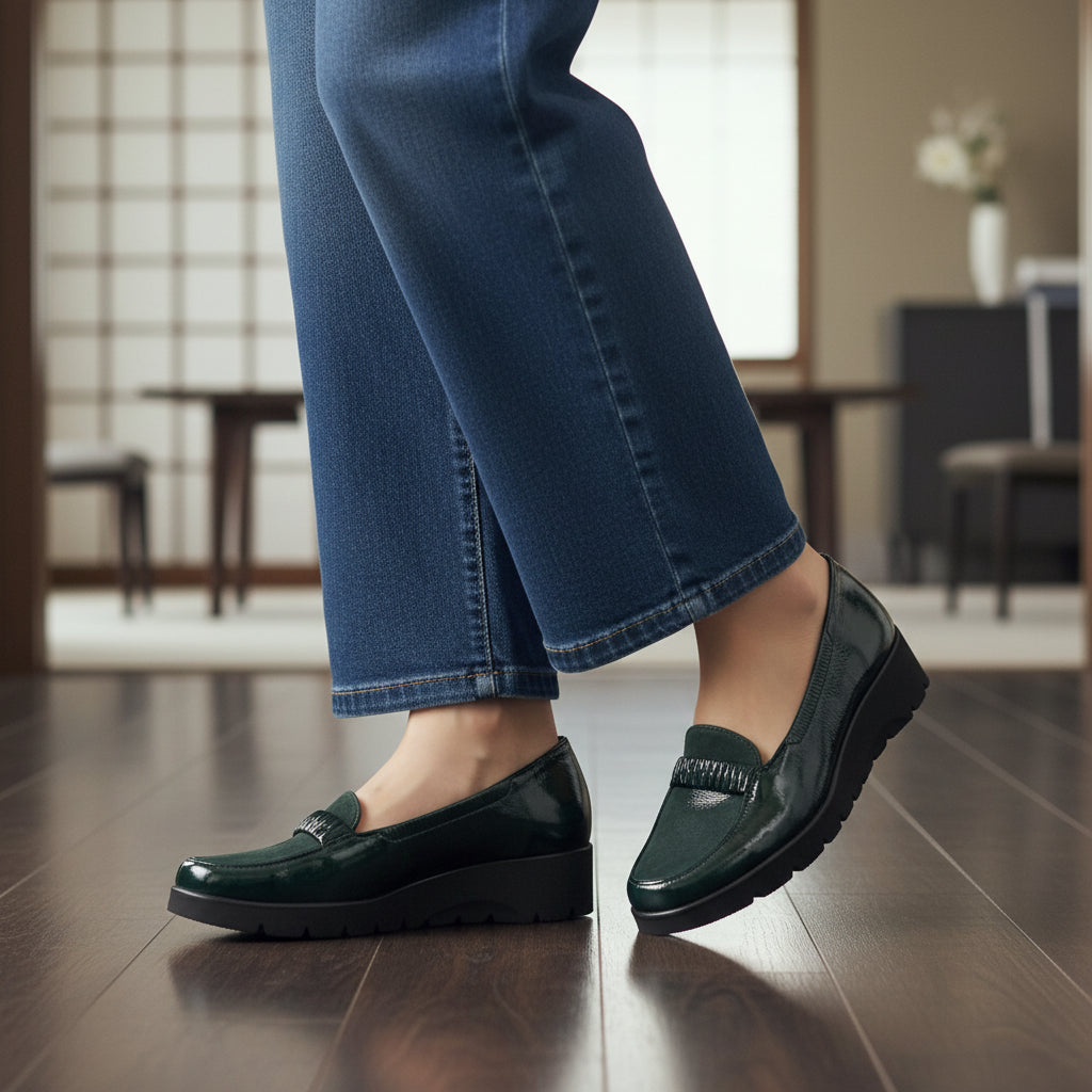 スニーカーのようなクッション性で好評の厚底カジュアルパンプス。中底を入れないボロネーゼ製法で作りました。返りが良く、柔らかい仕立てです。デザインは、サっと気軽に履ける浅いバランスのモカタイプ。程よく伸縮性のあるシャーリングベルトと、サイドのエラスティック仕様で足をしっかりホールドします。デイリー使いにぴったりな一足です。
