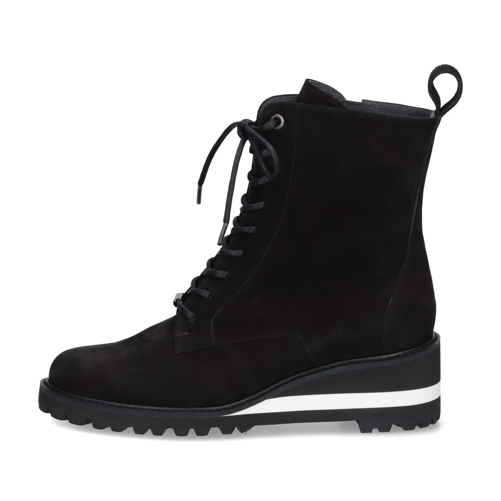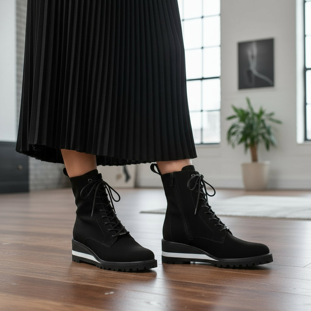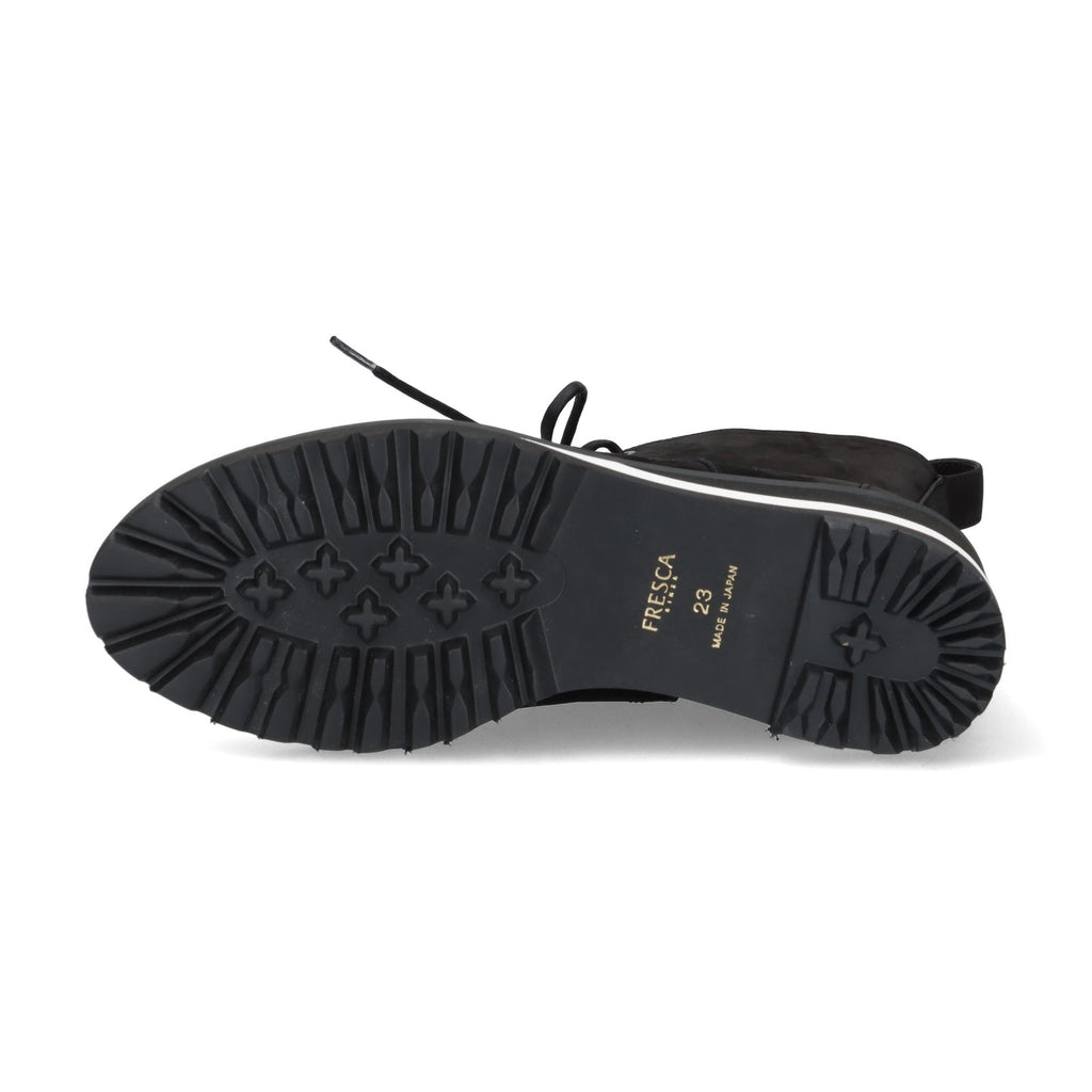 厚底のタンクソールを備えたウエッジヒールのレースアップブーツ。5cmのヒールが脚を長く見せてくれます。紐通しの管金具やアイレット金具(ハトメ)を施し、金属特有の輝きが本体に美しさとアクセントを与えます。裏材に人工スエードを使用し、ソフトな足当たりを実現。さらに適切なアーチサポートがあるオリジナルのカップインソールが足裏をしっかりと支えます。長時間の着用でも疲れを軽減する機能性とデザイン性を兼ね備えた、カジュアルなレースアップブーツです。