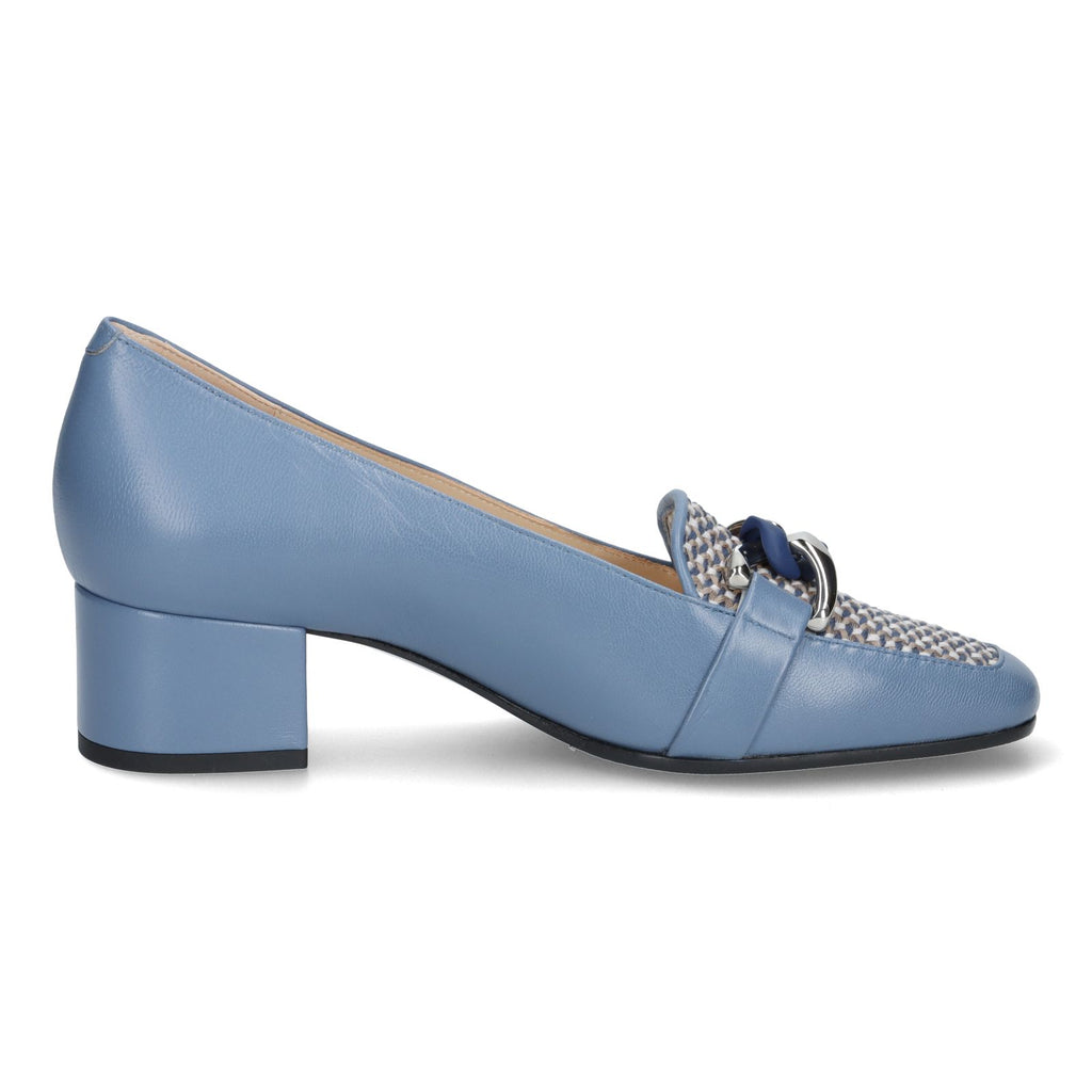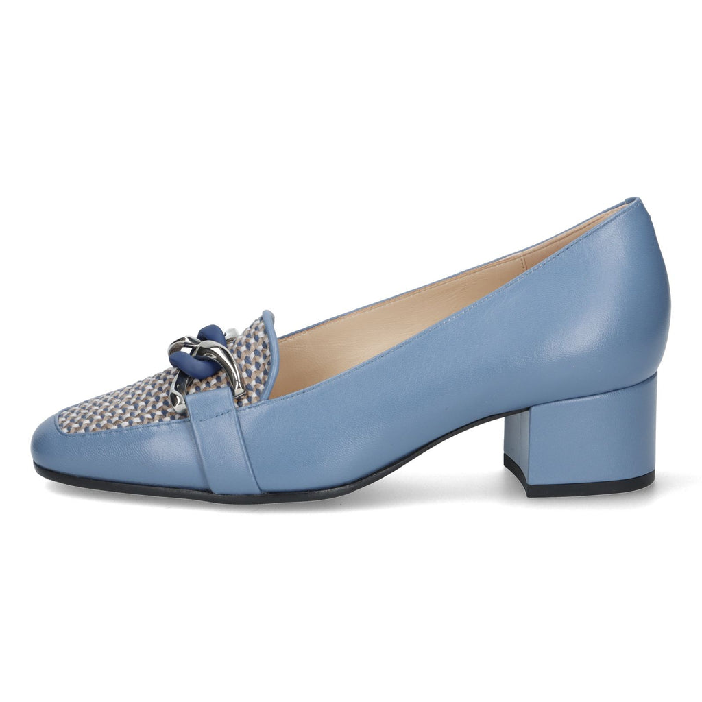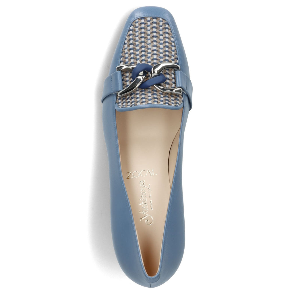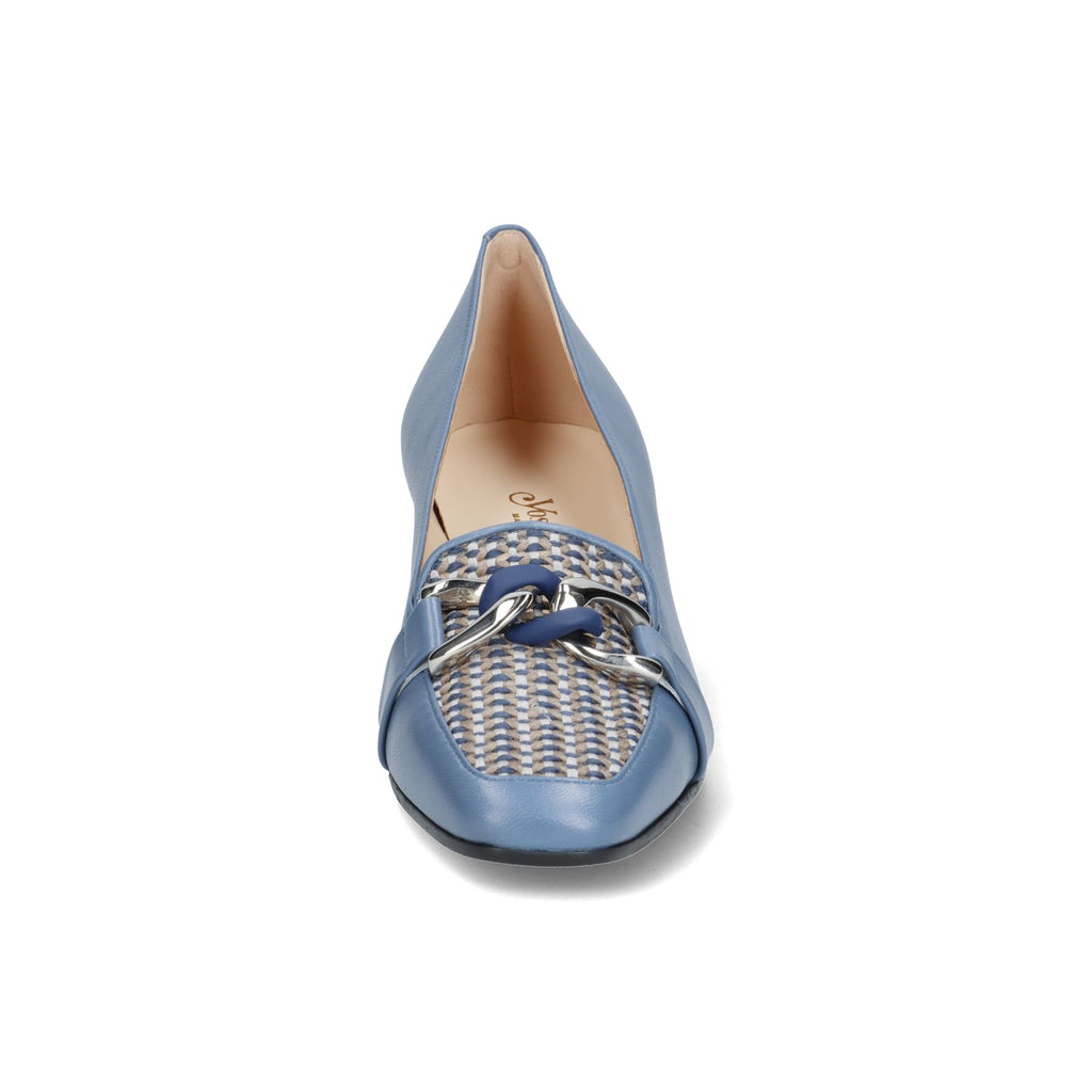 銀座ヨシノヤのオリジナル靴型をイタリアに持込み、日本人の足に合った靴型で作ったイタリア製のタウンパンプス。デザイン、素材、カラーはイタリアの感性をそのまま活かしています。異素材の組み合わせで清涼感とカジュアル感を演出しています。甲飾りは本体のカラーに合わせて塗装したチェーンと光沢のあるチェーンを組み合わせて表情があり価値観を高めています。